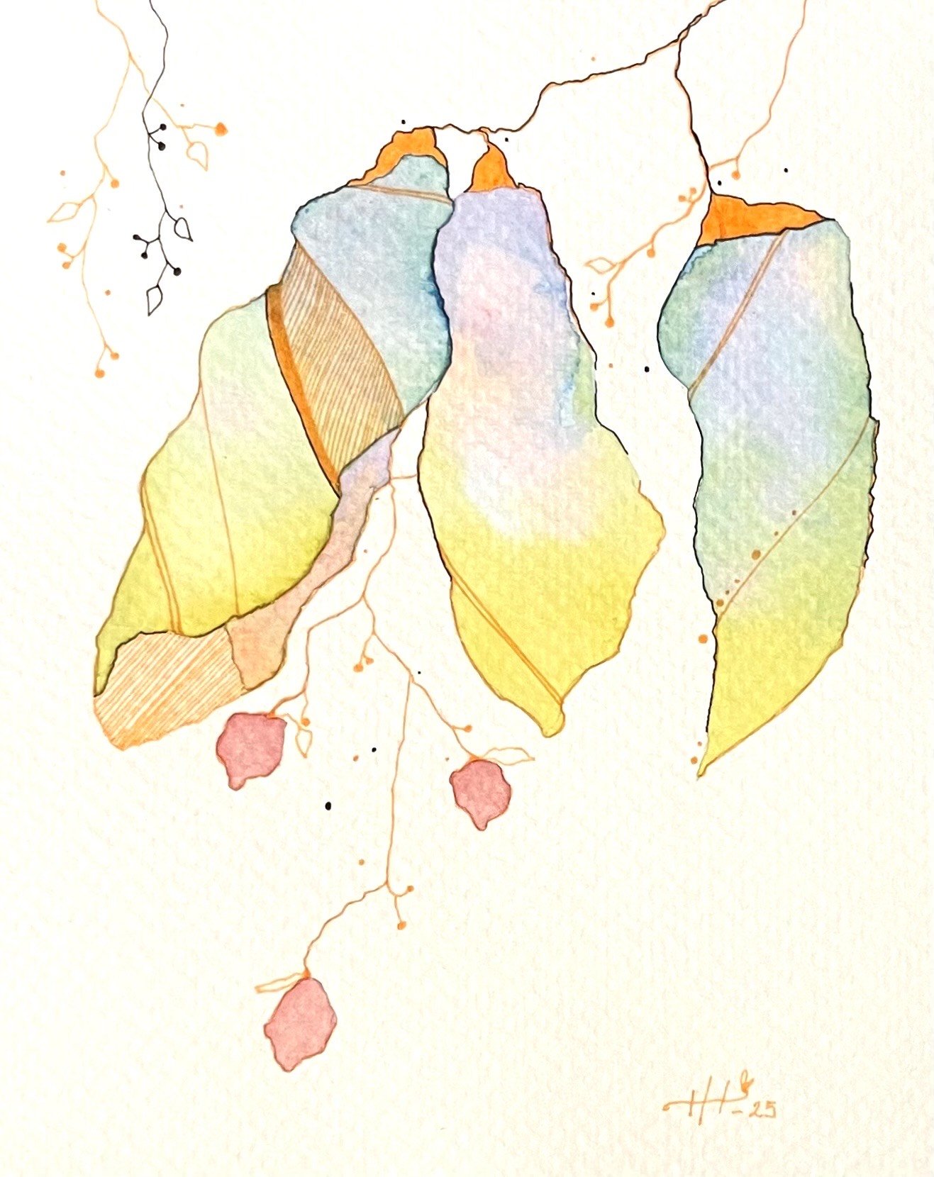 Maalaa akvarelliväreillä paperille erivärisiä ja erikokoisia väriläiskiä. Väriläiskät voivat mennä päällekäin. Anna väriläiskien kuivua.
